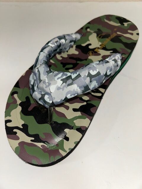Fujisndal 天板迷彩 鼻緒は、モスグリーンとライトグレーのモダンな柄で仕上げたハンドメイドサンダルです。迷彩デザインが特徴で、日常のカジュアルスタイルに自信を与えてくれます。どんなシーンにも馴染みやすく、足元にさりげないアクセントをプラスします。